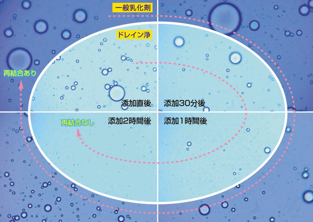 油脂を微細化して、排水管内での再付着・再結合を防止。詰まりや悪臭の発生を根本から抑えます。